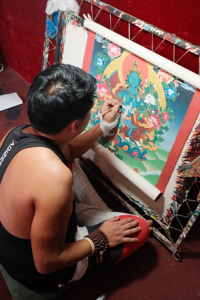 Around the Buddha there’s a host of shops selling traditional Nepalese paintings depicting the teachings of Buddha – the circle of life; true happiness etc. We spend some time watching the craftspeople paint these works of art, fascinated at the detail. The artists train for many years before being known as master crafts people.