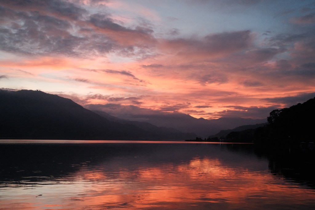 We spent the first evening in Pokhara wandering by the lake, the sunset was especially radiant, with the sky reflecting across the water. We figured the storms from the last few days had created some interesting clouds.