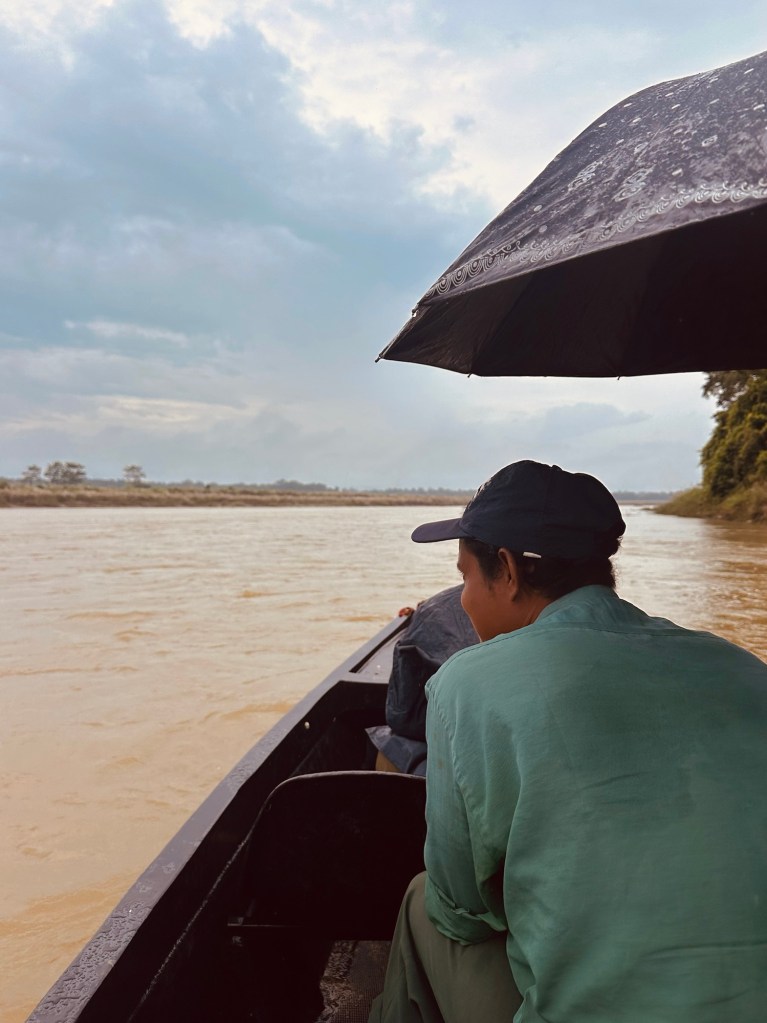 Day 1 on safari was a wet affair, so waterproof layers and hiking shoes were worn. Part one included boarding a narrow wooden canoe to travel down river. We were in awe as we cruised past a family of rhinos bathing in the river, only metres from us.