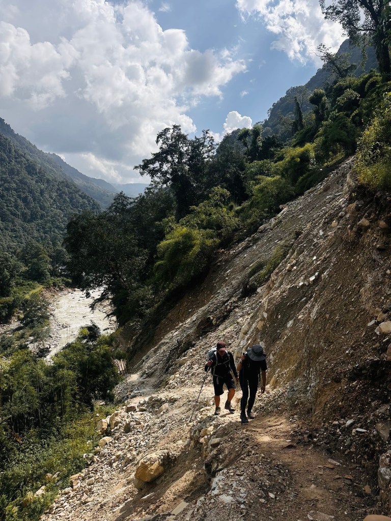 The first day is good, a gradual increase in elevation, with a few steep ascents and decedents. The rain holds off, but there are a few wet-ish bits in the jungle. And pretty quickly we realise theres leeches! Taking us back to our time in Chitwan the previous week. We think we’ve escaped them until at lunch when removing my shoes I notice a patch of blood on my sock. One crafty leech had managed to get through the wool and get a grip on the top of my foot. What a treat. De-leeching occurs and we get back on our way.
