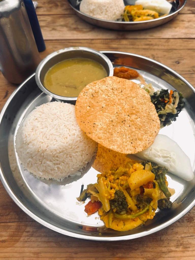 We made the decision to eat Dal Bhat for every meal while trekking, well, lunch and dinner. Saujan and Key are doing this too, so it felt appropriate. There are other meal varieties available, even pizza at some tea houses (spoiler – we spotted some people eating one and it didn’t look exactly Neapolitan). Saujan introduced me to Raksi, a wine made from grain on our first night, and it is delicious. A familiar kinda taste, a bit vodka-ish. From this moments onwards each evening features Raksi. It also happens to be the cheapest alcoholic drink on the menu.