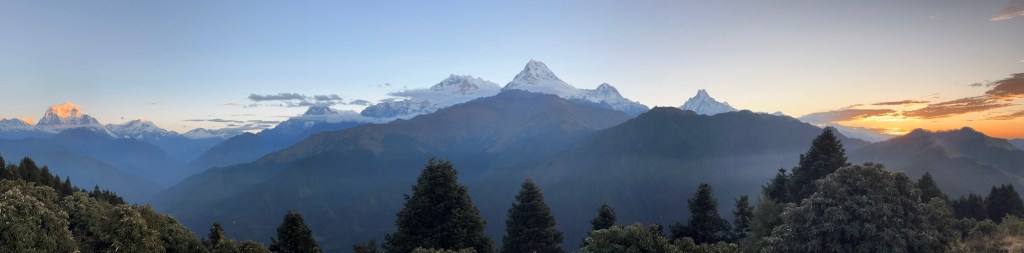 The views are spectacular, and we’re super lucky with the weather. No rain, minimal to no clouds in the sky once the sun comes up. From left to right, panoramic views of the Annapurna range. It’s hard not to keep taking photos, how do you capture this. We should remind ourselves to just look at it.