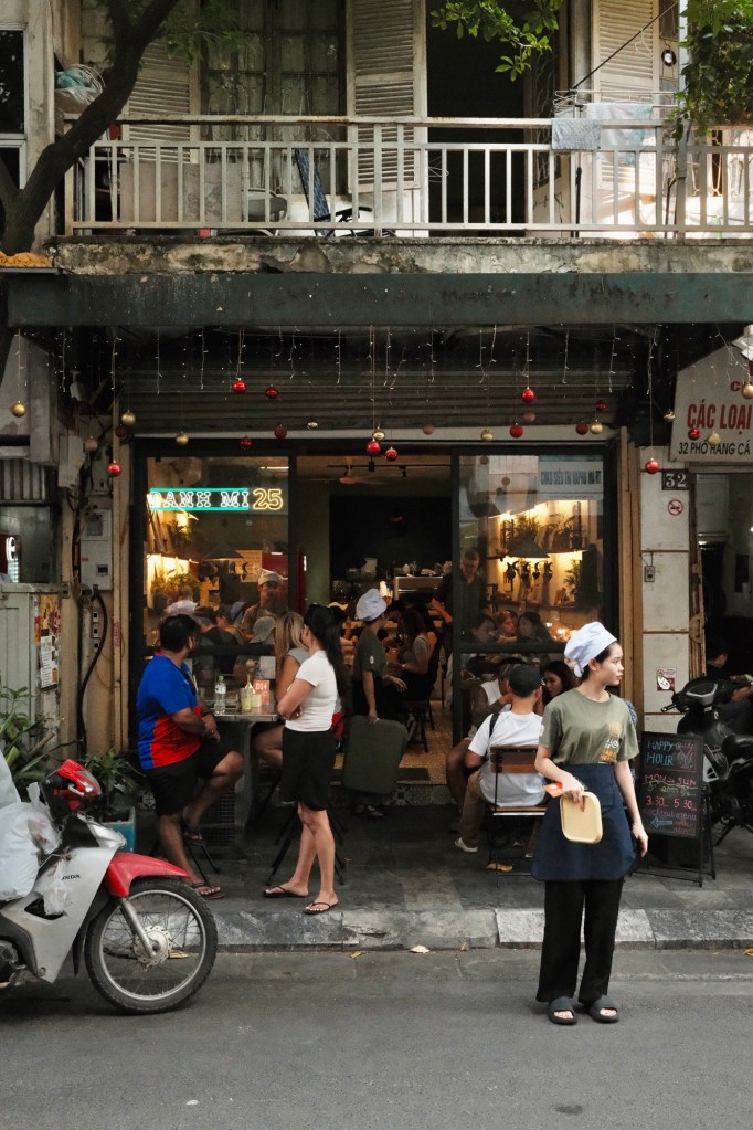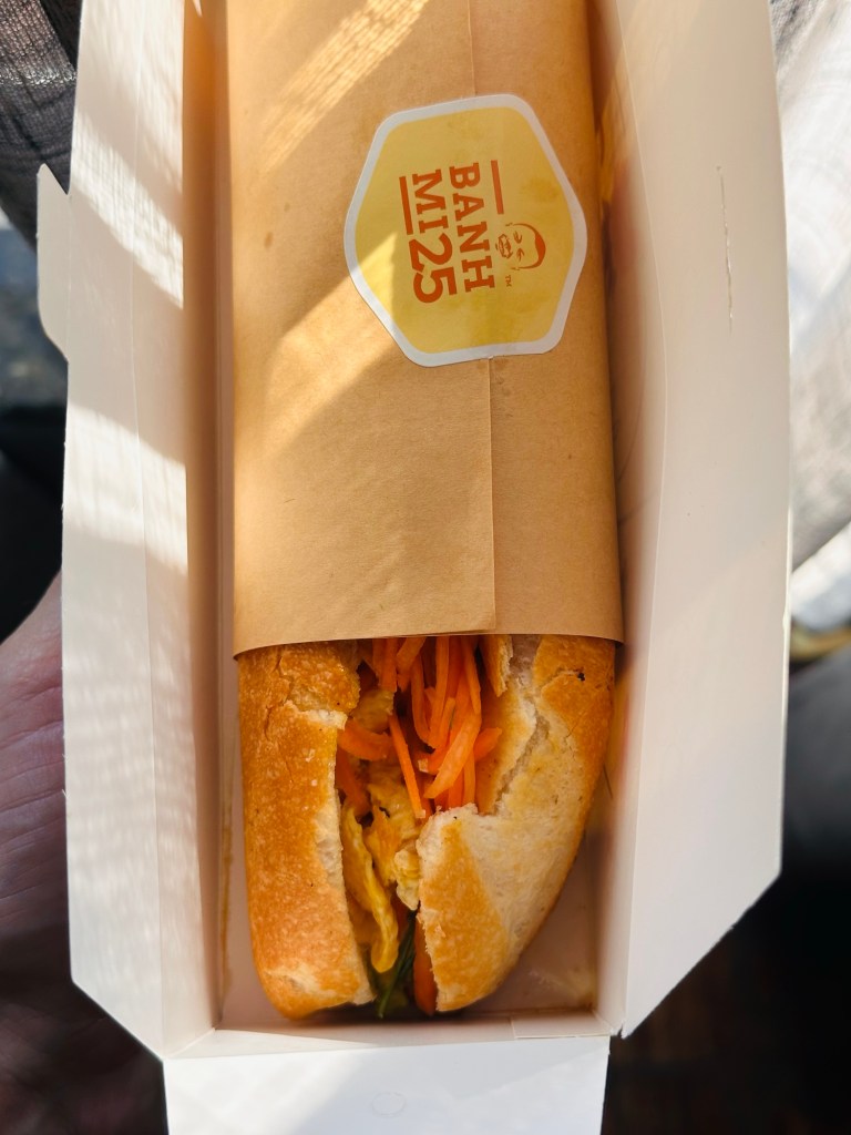 Banh Mi is an important topic when visiting Vietnam. The French-influenced bread with a unique mix of pickled veg, pâté, and normally pork or duck, with a helping of coriander, is rightly celebrated. Luckily for me, there’s often a veggie version available, with egg or tofu and the same salad/veg mix. The quality does vary, with the lower end of the scale being a bit bland and bready, and the higher end being a sublime mix of flavours and texture, symbolising one of the tastes of Vietnam. As this wasn’t our first rodeo in Hanoi, we were keen to sample some of the best. What was surprising was that a couple of good places from my last trip (2017) had blown up even bigger, now grand commercial enterprises. Which did mean hype, bigger queues, and more diverse menus, which reduced some of the charm. We searched out some new spots though, that certainly delivered on taste. Big thanks, James, for sharing his bahn mi ratings guide from a trip a couple of years back. Number one tip – pick up a Banh Mi before you head to the airport or train station for the perfect mid travel meal.