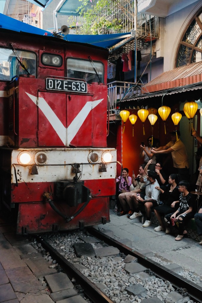 We had no plan to visit the famous ‘train street’. We both assumed it would be a totally overrated tourist hotspot with minimal enjoyment. But Hanoi had other ideas for us when we just happened to end up standing at the end of it with a train apparently due to arrive within the hour. We thought, well, we might as well indulge and see what it’s all about. We got a seat in one of the many bars that line the side of the tightly packed train track and waited for the train to arrive. As we waited, it got busier and busier, and tensions started to fray between some of the eager tourists. One particular incident involved French and German women, with the latter being annoyed that the other one was arriving late for the train spectacle and expected to get a good viewing angle or even a seat! Good entertainment as we quietly watched on. After an hour, the train arrived, and it was an intense few moments as we watched the bar staff try and make sure that no frantic tourist stood too close and got hit by the train. All in all, it was quite fun watching the train go by less than a meter from our faces. I even managed to get a few pics to capture the moment.