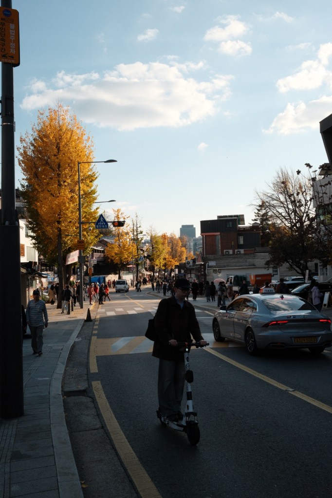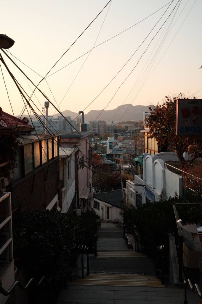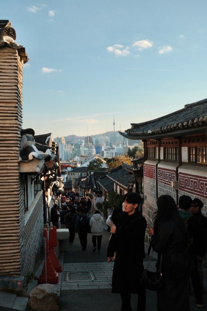 We walked from there to the nearby neighbourhoods, grabbing coffees en route. Like China, there are plenty of ginkgo trees everywhere. Bukchon Hanok Village is close by, where everyone wants to get a particular photo of old Seoul – it’s probably a bit overrated, but we did stroll through. I had what can only be described as the best banana milkshake I’ve ever drank at a place called Baekmidang. We stopped at an arts and crafts fair where Carmen bought a small porcelain hamster – a new mascot for our trip 🐹