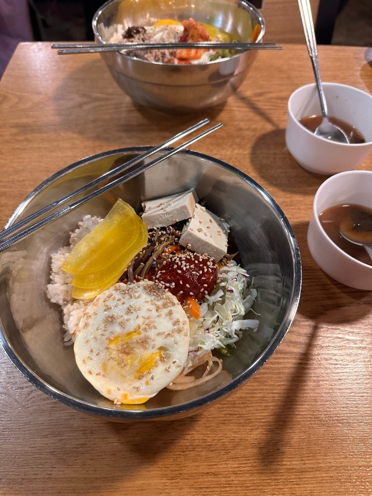 Our first Bibimbap – the famous Korean dish of rice and various toppings mixed in a bowl with a good helping of Gochujang (red pepper paste) and whatever else you want to add – was delicious. Number one tip is that you must mix it really well; I’ve definitely been guilty in the UK of barely mixing it. The restaurant host even checked our mixing quality to make sure we were about to receive the correct Bibimbap experience.