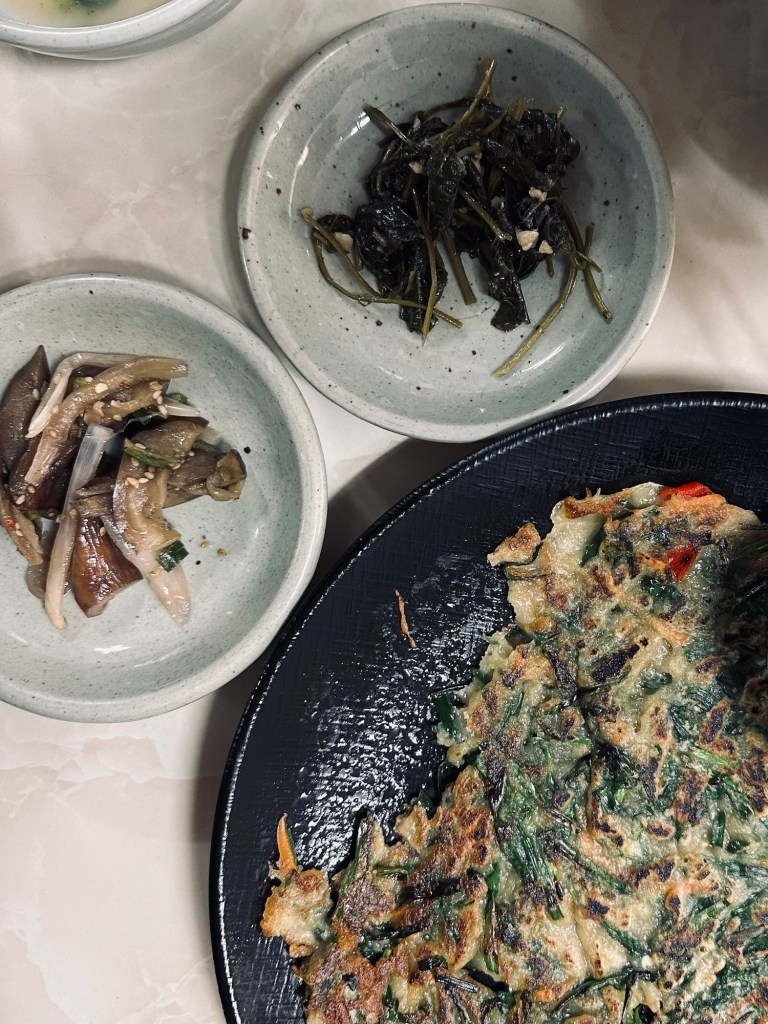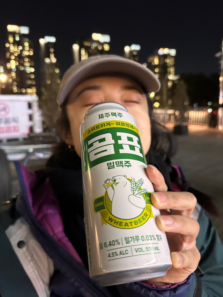Other notable highlights were walking the covered market in Seogwipo – there’s lots of food to pick from. Eating the Jeju oranges which grow all over the island, our hotel packed various orange delights into our breakfast – jams, juice, and biscuits. After our snowy hike, we went to a veggie restaurant called Soombida 숨비다, where we had a Mapo Tofu, soup, and a few other dishes. They made a sparkling Jeju orange soda which I’ll try to recreate back home.