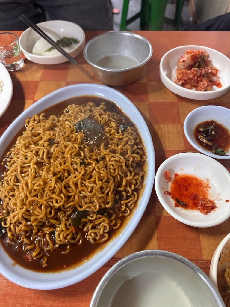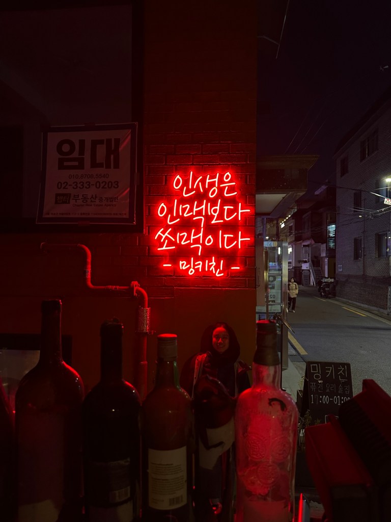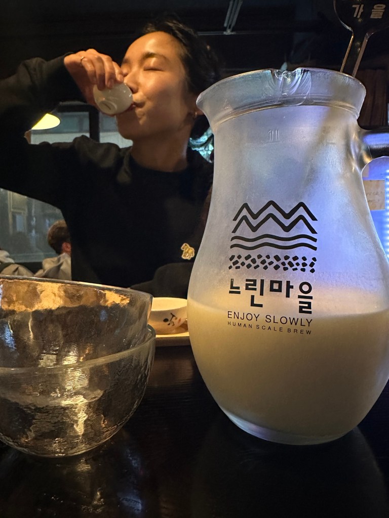 We ended our final evening in Seoul at the perfect budget friendly eating and drink spot: Seoul Sikpum 서울식품, a total hidden gem, upstairs in a small alley. It was everything I was looking for in a place where you drink, eat, and sample some Soju. We had fried noodles (the packet kind in a dark sauce); Tteokbokki; fried eggs and Spam (for Carmen); and a crispy seaweed pancake. Of course, there was plenty of kimchi on the side, and we got to pick the Soju we wanted ourselves from a fridge in the corner of the room – we opted for the traditional, less sweet version, and we also got a bottle of rice wine to drink alongside (white in colour). A Soju fact – Jinro Soju (the most commonly seen brand) is the most sold alcohol in the world! It felt fitting as we entered; there was a group of very drunk locals at a table, who seemed like they’d been in there for hours. One of them welcomed us by checking we got the right Soju, and increasing the amount of self-serve kimchi we had put on a plate – more was required.