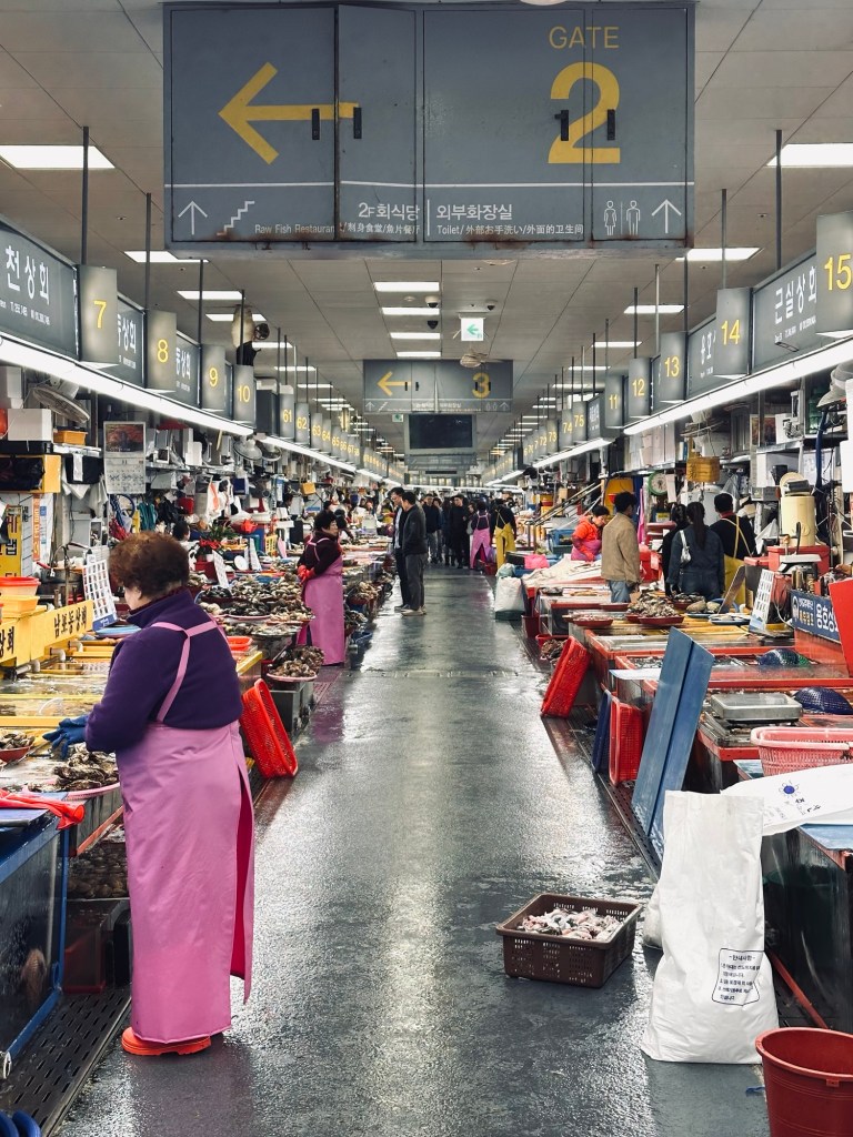 Carmen had her eyes set on a visit to the biggest wet fish market in South Korea, known for its huge range of sea creatures that could be selected and cooked for you. On entering the market, it was apparent that this place was quite the spectacle – vast tanks of live creatures, all shapes and sizes – some trying to escape their inevitable fate. I spotted an octopus making its way out of an enclosure and onto the floor, but to be pulled back in by the stall’s proprietor. I also witnessed a fish jump right out of the tank – it didn’t make it back.