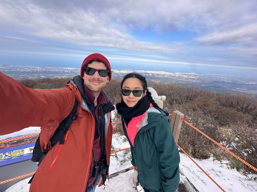After our mountain rejection, we found a nice spot about 20 minutes’ drive away, where we could walk up a smaller peak and get a great view of Jeju and of Mount Hallasan. A perfect alternative. The walk was snowy and a bit icy, and we did spot quite a few wearing basic crampons, but it was an easy hike. We chatted to a local family at the top who said we were lucky as the weather is rarely clear where we were, so getting the view we did was a luxury.