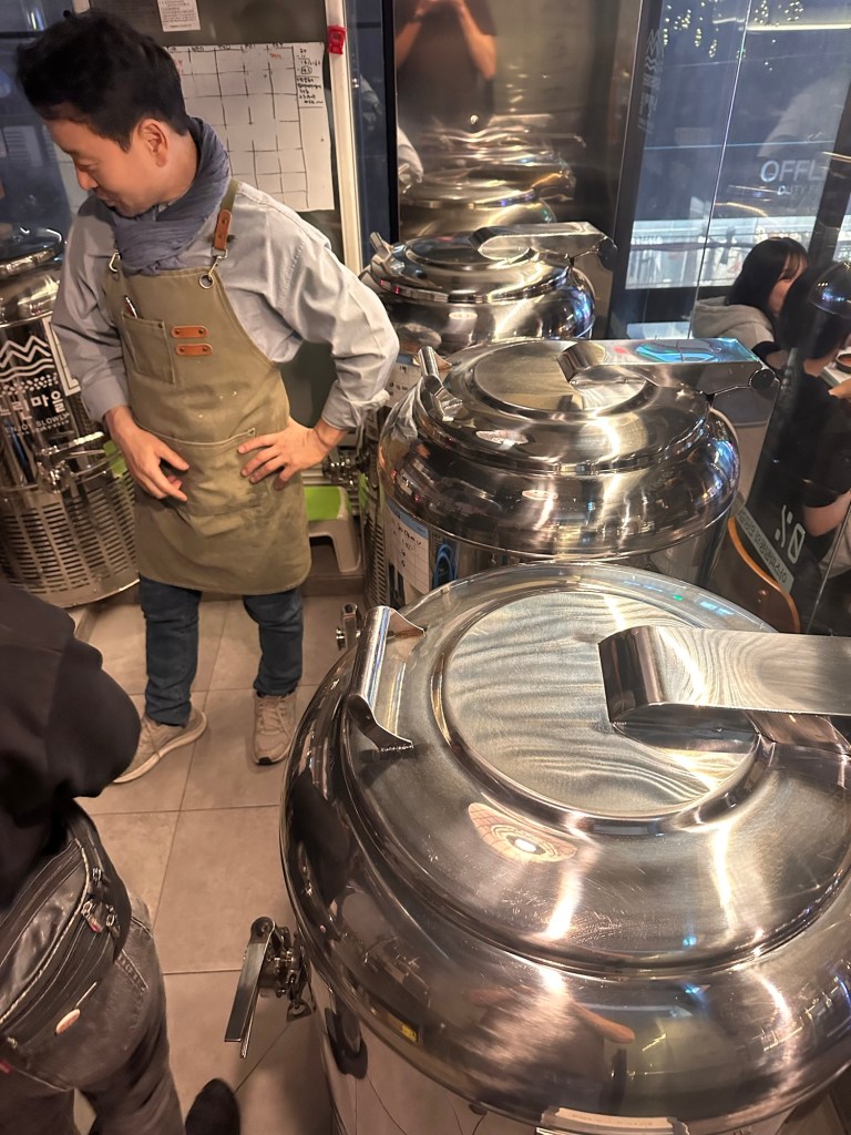 The hunt to complete the above list was on. First up, we headed to Hongdae (where we stayed first time round), and Carmen found a Korean fried chicken restaurant which did a veggie version alongside the regular varieties. The portions were massive and it tasted good – 8.5/10. They also sold Tteokbokki too, so double ticks on our list. We then had rice wine at a brewery/bar nearby where the owner showed us how he brews his rice wine, before we sampled four different styles, 10/10.