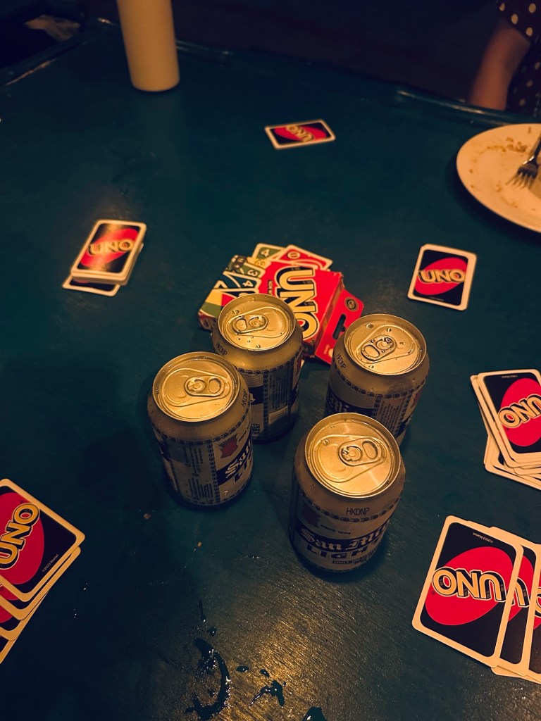 Each camp came with one of the crew moonlighting as a bartender, supplying a limited but equally perfect set of drinks – ice-cold beers, gin or rum, and what we became all too familiar with, Jungle Juice (rum and juice). Each evening the whole boat party gathered round for the first drink and raised a glass to the day, before sitting down for dinner around long tables. Dinner was as delicious as breakfast and lunch. Various card games ensued, with a few too many jungle juices and beers to follow. A game was introduced that I didn’t know but seemed a right of passage for our new Dutch friends – Kings Cup. The rules seemed to change frequently based on who was chairing, but it always ended up with too many drinks. We also had a good few games of UNO. Lloyd brought Harry Potter Top Trumps, which he’d been holding onto, following a spare of the moment airport purchase, but it didn’t turn out to be our favourite game of the trip 😂 At one point we even questioned whether it contained all the main characters of the franchise 🪄