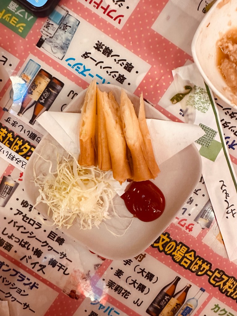 We spent the evening in the covered market at a small izakaya (essentially a pub serving food). Everything we ordered was delicious and fairly cheap. Think Japanese tapas when it comes to the food – smallish plates of simple dishes, sashimi, tofu, edamame, spring rolls, yakisoba. It was also at this point I realised the Lost in Translation (2003 movie) Whisky Brand that Bill Murray is advertising is, in fact, a very real and popular alcohol company sold in Japan. “For relaxing times, make it Suntory time” (that’ll mean nothing to you if you haven’t seen the movie 😂).