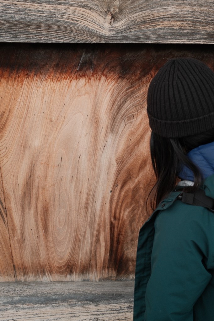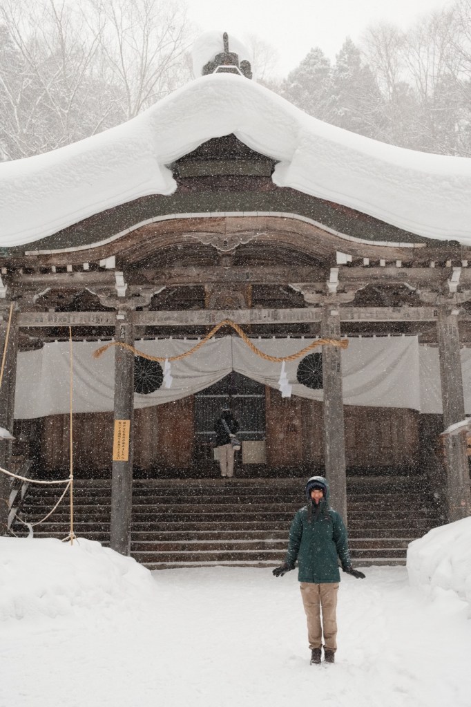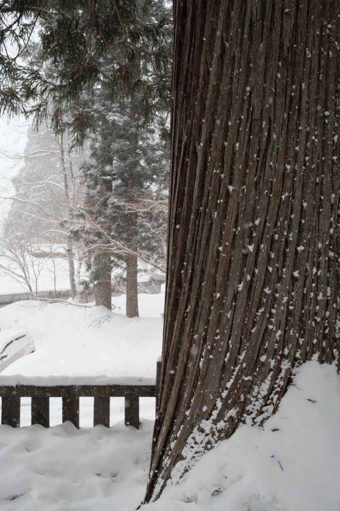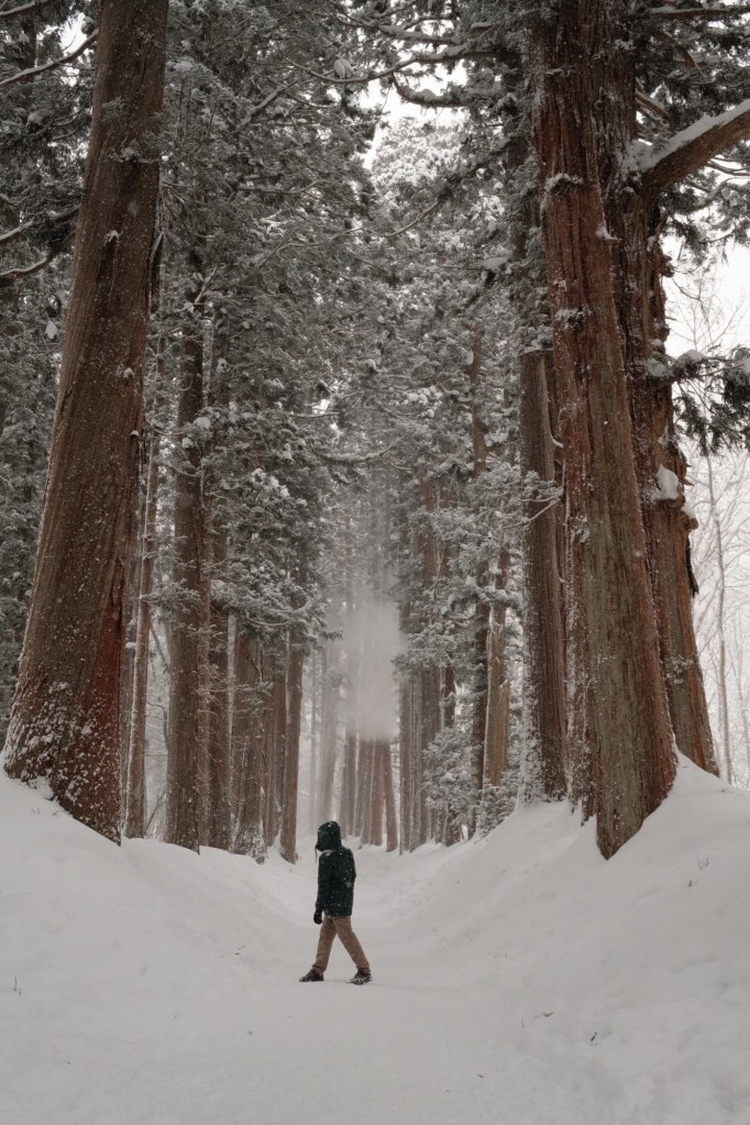 On our final day in the Alps, we visited Nagano city, and a huge forest of trees about 40 minutes’ drive north-west of the centre, named Togakushi Shrine. Our car struggled to get through the now very snowy mountain roads, with the wheel arches filling up with ice – which required some serious chiselling away at one point to stop the tiny tyres from rubbing against the ice. The forest has a long trail where you work your way through huge Japanese cedar trees covered in snow. The perspective and scale of it is so impressive, with plumes of snow gently falling as you walk underneath.