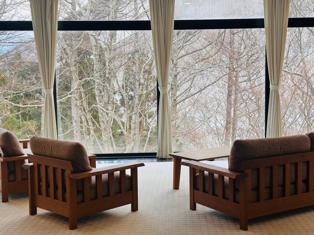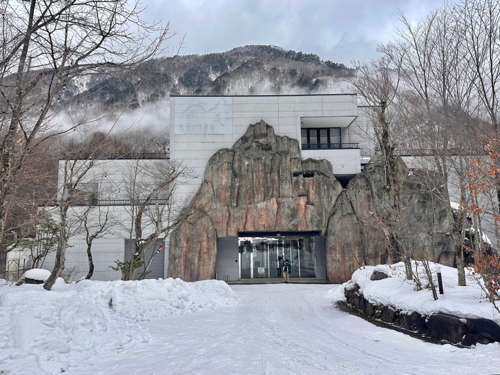 Our hotel for the next two nights had an interesting appearance, half pretend rock, half modern. It had a Shining-like vibe as soon as we entered, with one member of staff checking us in, and no other guests visible, and an endless winter visible through every window. Our room was huge and we had our own private Onsen, which was a bonus.