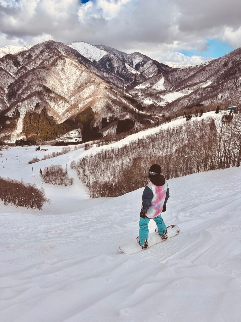 Our plan for the day was to snowboard at a nearby resort called Hida Honoki Daira. It was only about a 20-minute drive from the hotel. The resort had a large car park where we could easily get a space, and there was a range of hire shops that you could rent gear from. I’d picked what seemed to be the most popular place with the best range of boards and clothing. Within five minutes, we were kitted out with good-quality jackets, pants, boots, and a board, all for about £50 with a full-day lift pass included as well. 🎿