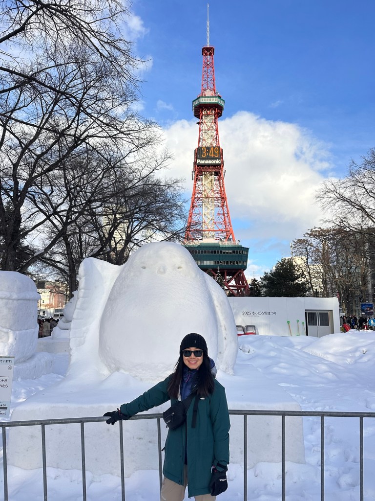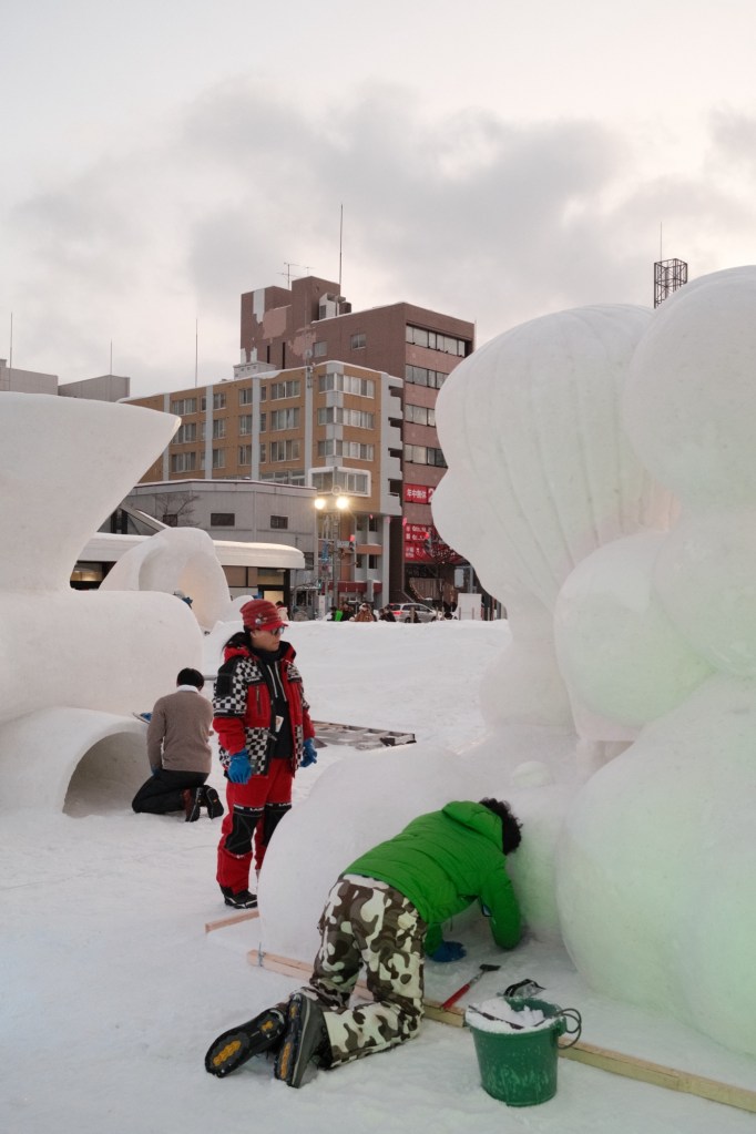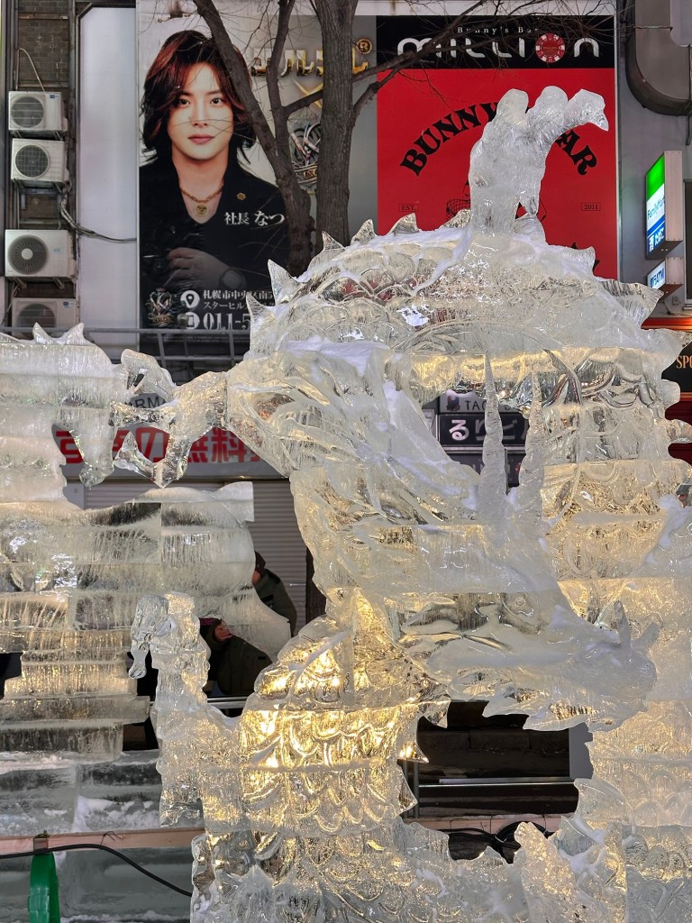 We spent two nights in Sapporo to visit the ice festival, which was a great experience. Multiple areas of the city are lined with vast carved ice sculptures – many by nations invited to take part in the annual carving competition. There’s everything from Pokémon to castles carved out of ice and lasting for over a week. We observed Thailand creating a giant ice elephant and Poland carving a giant brain.