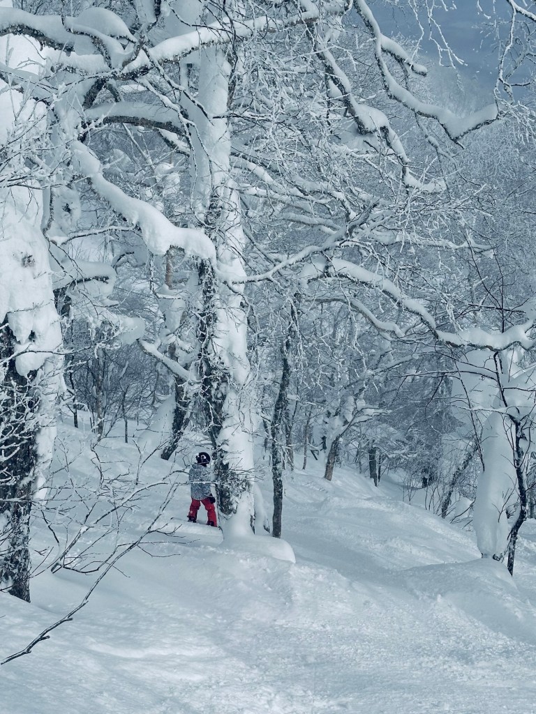 At the top, the wind was howling, and it was freezing. We had to act quickly if we wanted to board the runs with the snow monsters. We entered the void and strapped our boards on and started moving into a sheet of white. It was that feeling of snowboarding without any sensation of moving. Eventually, visibility improved, and we got a glimpse of the snow monsters— and they were like nothing I’ve seen before on any mountain. Huge trees completely covered with snow and ice, frozen until spring or later. An example of just how much snow Japan gets during winter.
