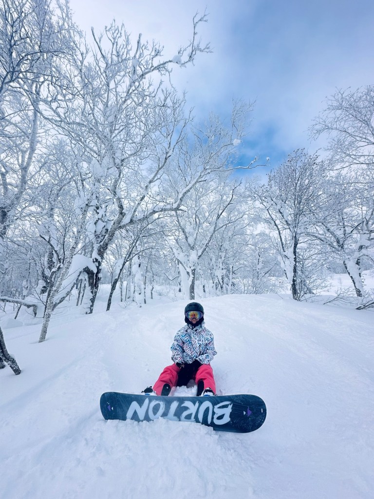 We woke early to catch a bus to Zaoonsen, and it was one of those times we were glad we arrived early; the queue was already big and many more tried to join it after us. We hadn’t reserved any equipment, but from previous weeks this hadn’t been a problem. But to our surprise, most places didn’t have any boots or boards left. Luckily, we found one place that could help, but we had to wait a good 45 mins to be served. Another Mr. Benn experience was provided, and we picked some great outfits— Carmen had an all-in-one pink ski suit from the 90s.