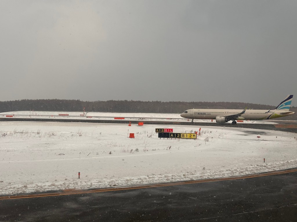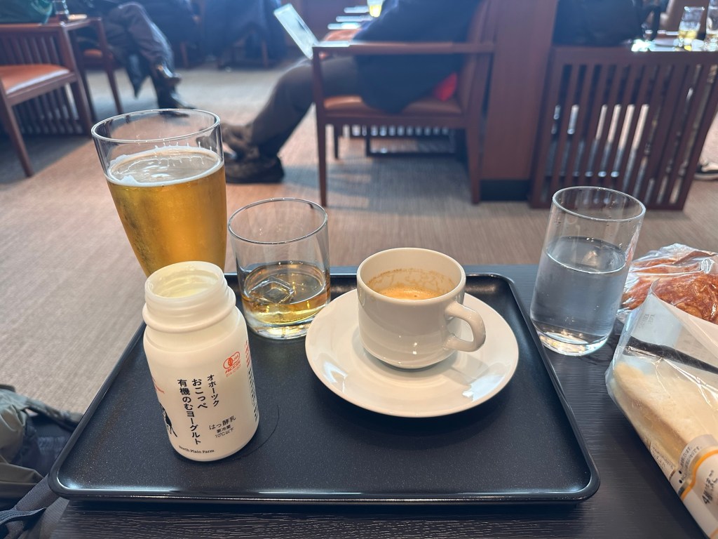 The next morning, we took a flight from Sapporo to Yamagata, south of Hokkaido but still north of Tokyo. We indulged in free airport lounge access and had coffee, yoghurt, beer, and whisky (repeat) for breakfast – well, at least one of us did.