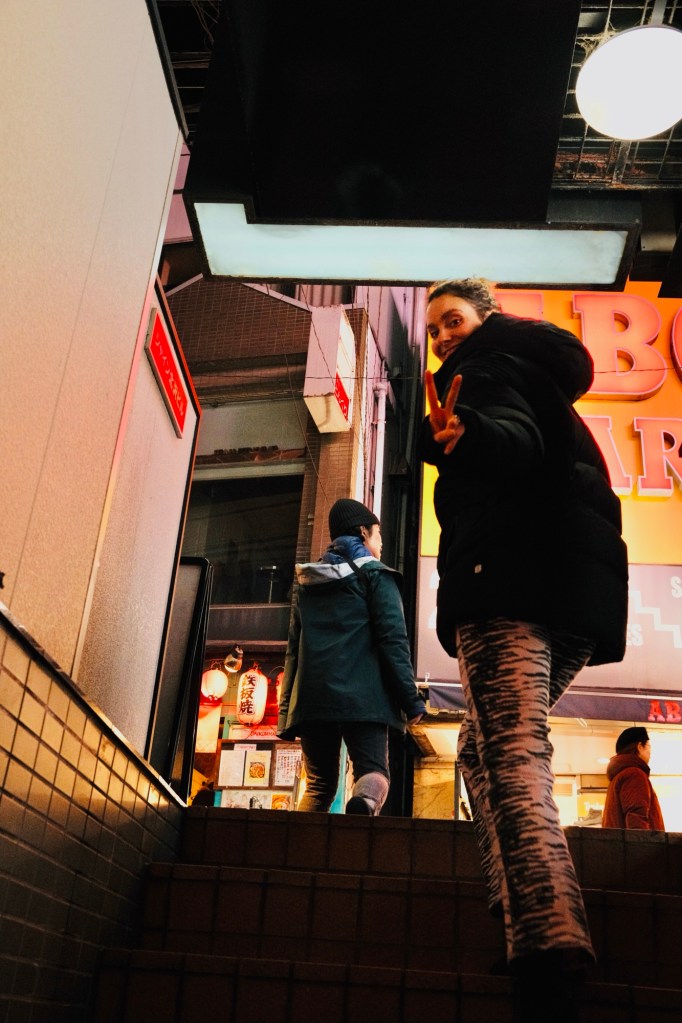We get started with Shabu-shabu (Japanese hot pot) and unlimited drinks (Carmens idea, not mine 😂), followed by stop in a bar that is themed around giant dragons and Harry Potter style cocktails. More drinks in a tiny whisky bar hidden beneath the street, where the highly trained smartly dressed bar tender serves up high grade Japanese whisky on the bar in very moody low lighting. The whole place only seats 8 and smoking is very much allowed in Japanese bars, which adds a certain nostalgic feel to the place, but it also makes your clothes stink for days. After a few whisky’s Manon is craving Karaoke so we quickly find a place nearby – a locals spot by the feel of it, with an ecollective bunch of people. This is where night one gets a little blurry. I definitely didn’t take part in the karaoke but Carmen and Manon did. At some stage I take myself back to our apartment, struggling to unlock the door using the codes provided.