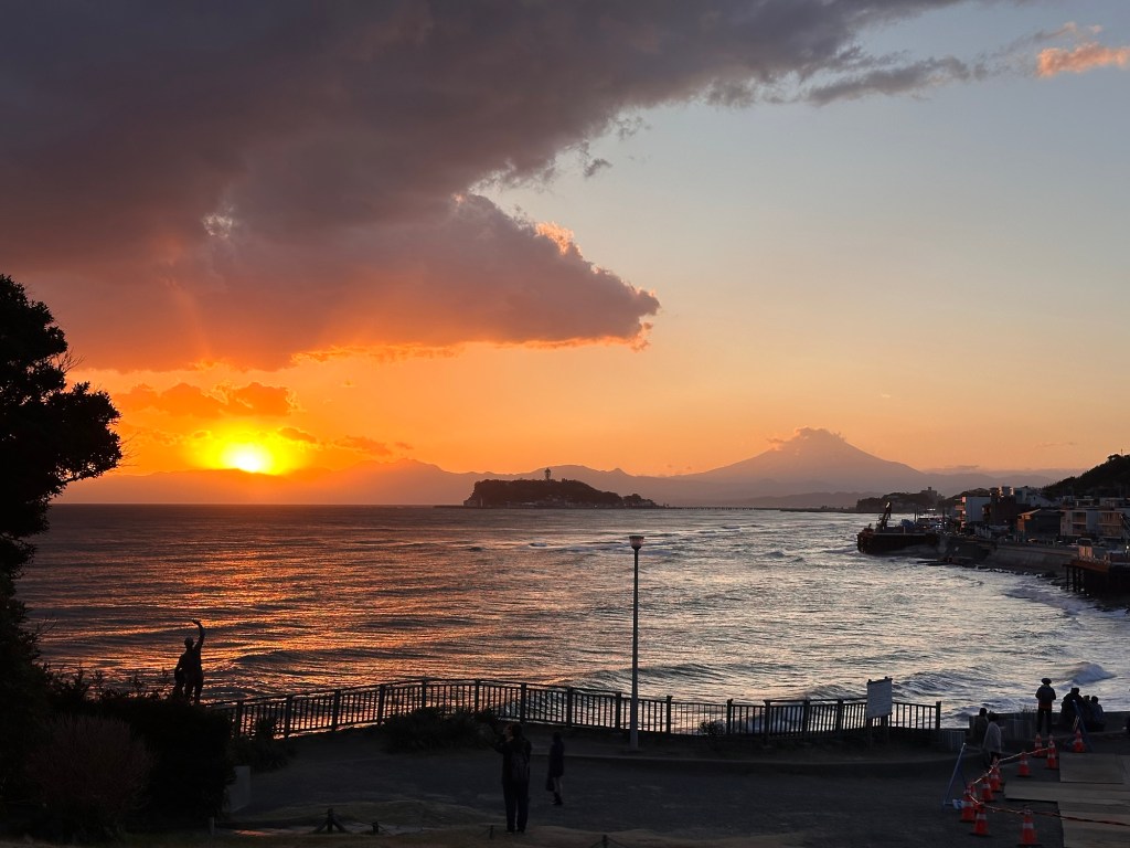 After checking in to our hostel we walk along the coast to a spot where you can apparently see Mount Fuji in the distance on a clear day. And it does indeed reveal its self when we get close. We spend a good hour sat watching the sunset with Fuji poking out of the horizon. In a couple of days we’ll be right next to it.